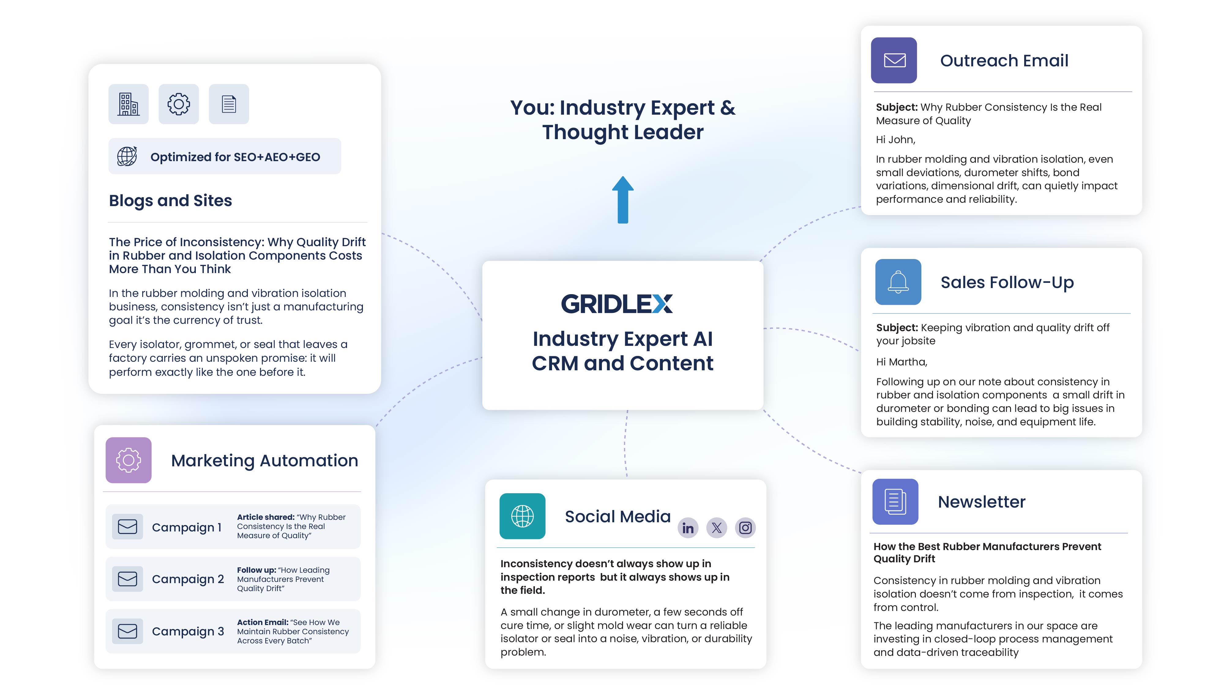 Gridlex connects content creation directly with CRM data, marketing automation, and analytics. This integration ensures expert insights reach every channel — from thought-leadership articles to personalized sales emails — with measurable impact.