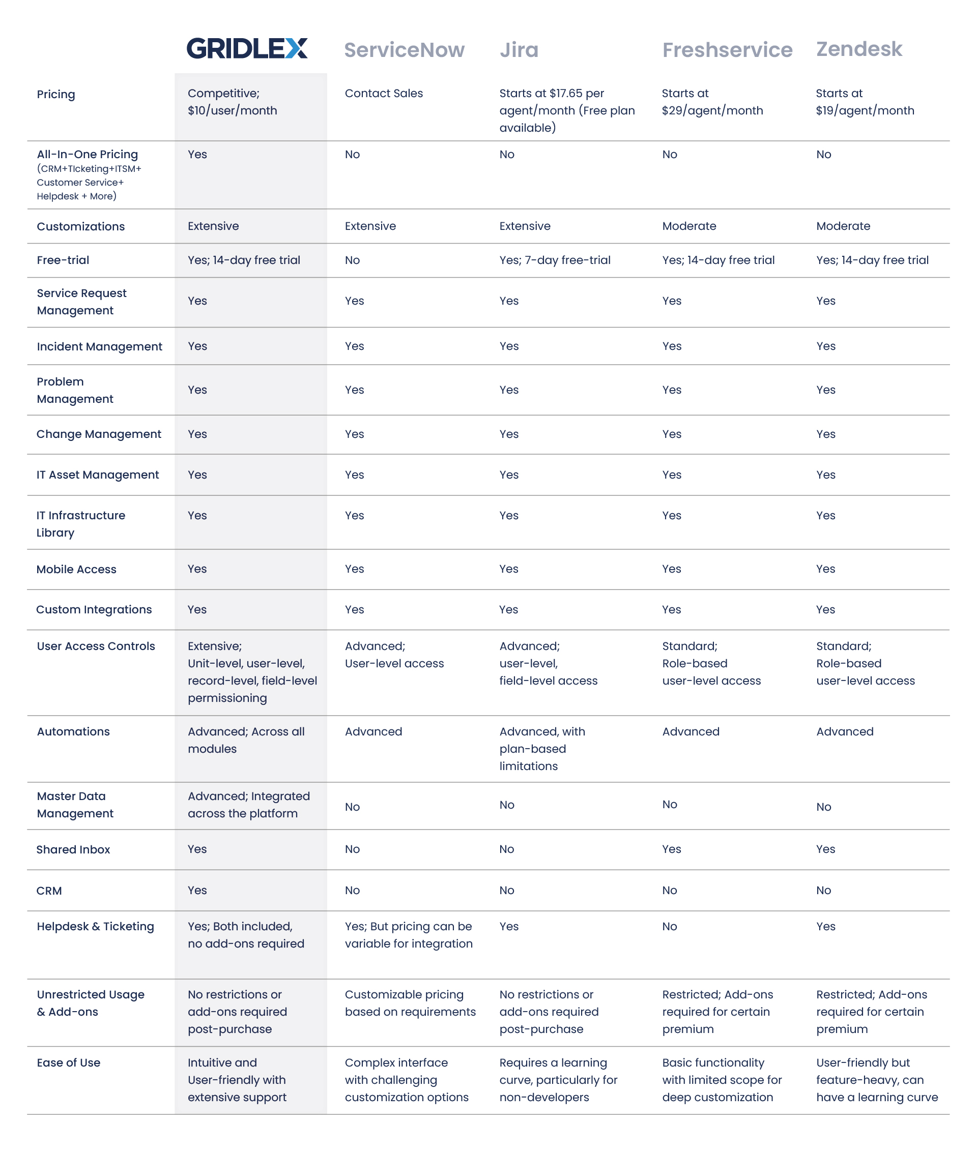 Selecting the right IT Service Management (ITSM) software is key to enhancing your organization's IT support and operational efficiency. In this guide, we've reviewed top ITSM solutions like Gridlex, ServiceNow, Jira Service Management, Freshservice, and Zendesk, each with unique features tailored to different business needs. Consider the specific functionalities, integration capabilities, and scalability of each option. Choose a platform that aligns with your IT requirements and growth plans to ensure it supports your business effectively, boosting productivity and user satisfaction.